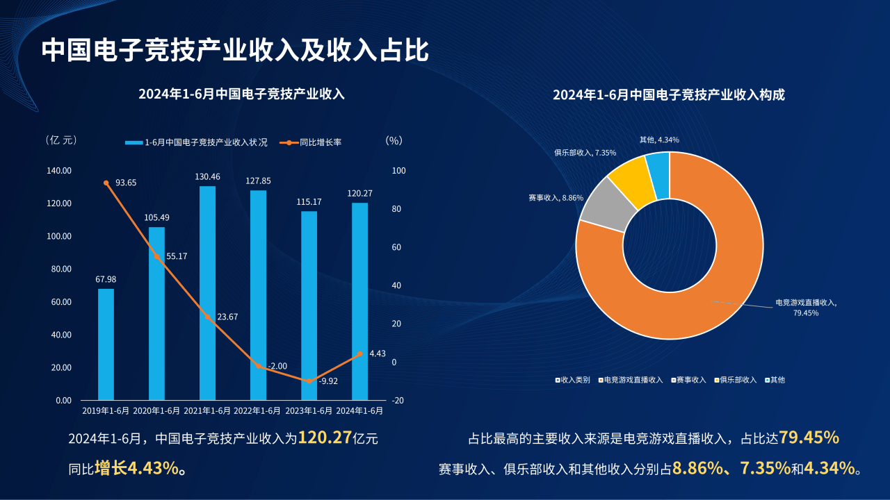作为新兴体育产业,电竞颇受关注。中国音像与数字出版协会此前发布的《2024年1-6月中国电子竞技产业报告》显示,我国电子竞技用户规模为4.9亿人,同比增长0.52%;电子竞技产业上半年收入为120.27亿元,同比增长4.43%。