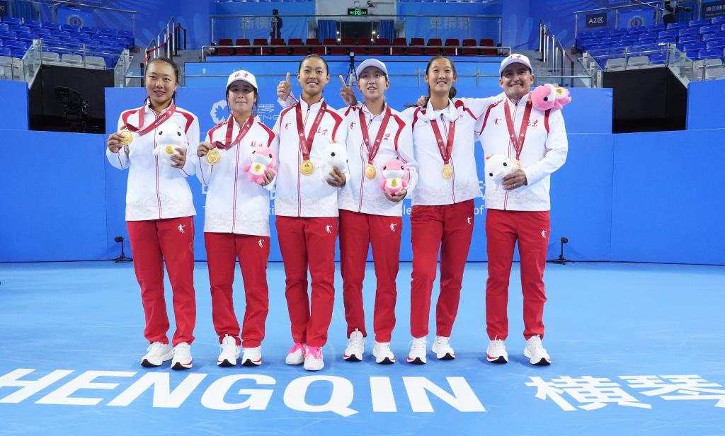 11月12日,冠军北京队在颁奖仪式后合影。当日,在横琴进行的第十五届全国运动会网球项目青年组女子团体决赛中,北京队2比1战胜湖北队,夺得冠军。新华社记者 颜麟蕴 摄