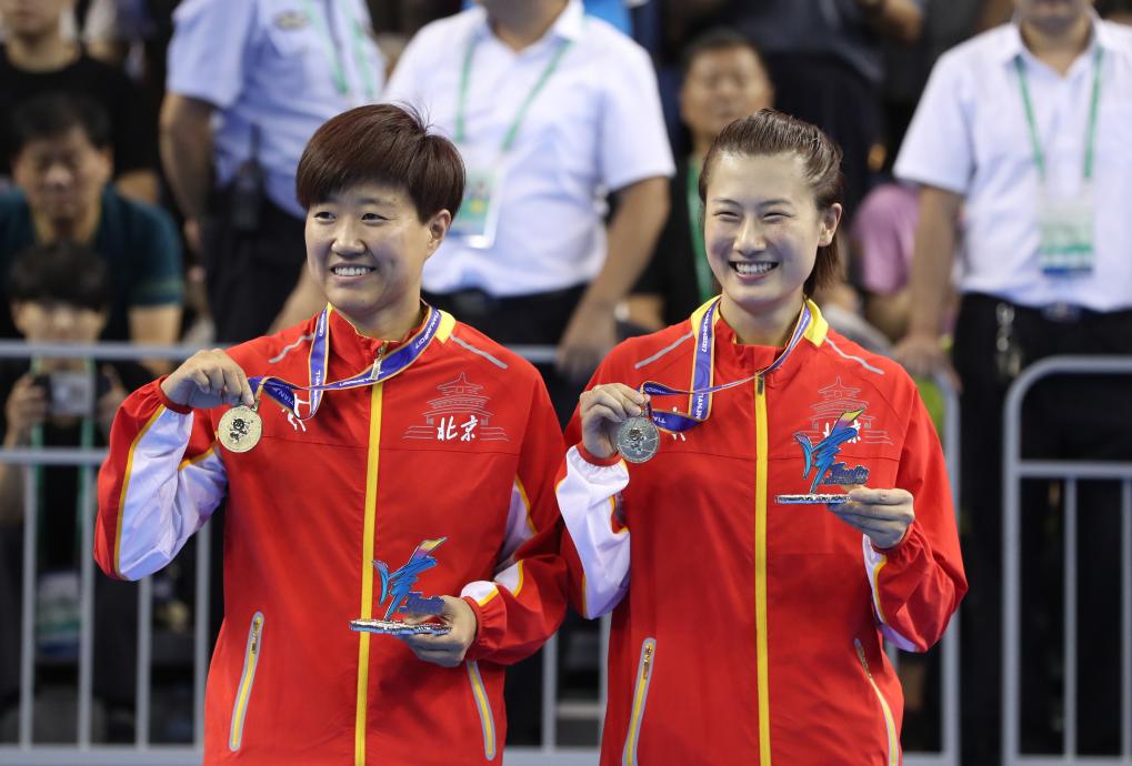 2017年9月6日,丁宁(右)与教练在颁奖仪式上。当日,在天津举行的第十三届全国运动会乒乓球项目女子单打决赛中,北京队选手丁宁获得冠军。新华社记者徐子鉴摄