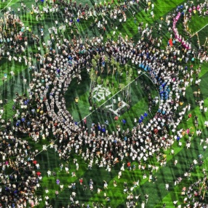 8月23日,人们在贵州“村超”球场跳苗族芦笙舞(无人机照片)。新华社记者杨文斌 摄