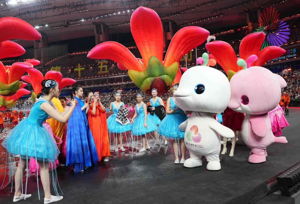 2025年11月9日,演员在第十五届全国运动会开幕式后与吉祥物“喜洋洋”和“乐融融”互动。新华社记者 吴鲁 摄