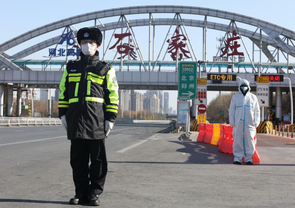 ↑1月7日,石家莊市公安局交通管理局裕華東警務(wù)站民警在新元高速石家莊裕華路進(jìn)出口執(zhí)勤。