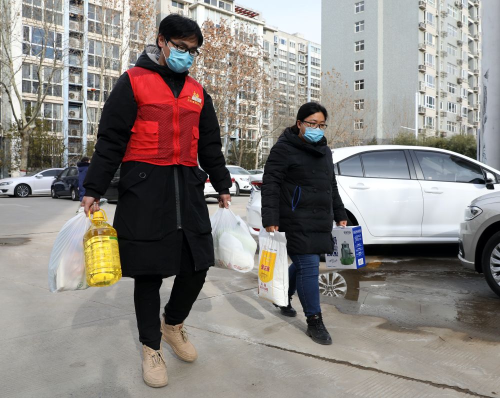 ↑1月10日,在雅清苑社區(qū),志愿者(左)幫助居民配送生活物資。