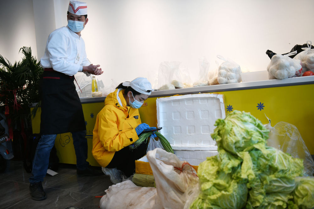 ↑1月11日,汪新建(左)和張琪琪夫婦在準(zhǔn)備給鄰居們送菜。生活在河北石家莊市玉蘭苑小區(qū)的夫婦二人,在小區(qū)門口開了一家餐廳,夫妻倆帶著廚師和司機(jī),為社區(qū)的工作人員免費(fèi)提供盒飯,義務(wù)給鄰居們跑腿買菜。