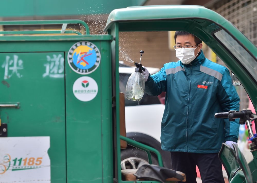 ↑1月10日,在石家莊市匯通路郵政快遞投遞部,工作人員對(duì)投遞車進(jìn)行消殺。