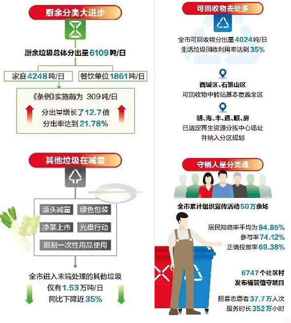 ??? 《北京市生活垃圾管理條例》已滿8個月,北京市城市管理委員會交出的“成績單”顯示,家庭廚余分出率、垃圾減量率等重要指標快速提升,市民踐行垃圾分類新時尚的自覺已初步養成。