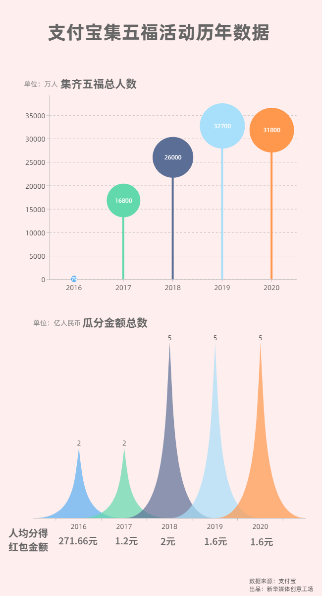 自2016年支付寶推出“集五福”的活動至今已有五個年頭。從最開始只有幾十萬用戶參與,到如今幾億人共同狂歡。支付寶數(shù)據(jù)顯示,截至2月11日零點,支付寶集五福活動共寫下近5.7億個福字,共2.6億網(wǎng)友在線上手寫了福字,送給親朋好友,其中還有350萬福字通過支付寶打印、寄送回家。今年參與紅包拜年的用戶上漲了近270%,“紅包”相關(guān)搜索量也隨之大漲538%。