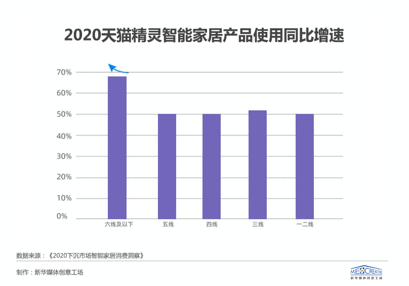 根據(jù)《2020下沉市場智能家居消費洞察》顯示,50%以上的天貓精靈智能家居使用者在三到六線城市,其中六線城市用戶增速最快,四線城市銷量、銷售額增長最快,下沉市場正在成為智能家居行業(yè)的新藍(lán)海。同時,根據(jù)天貓平臺數(shù)據(jù)顯示,智能開關(guān)、智能落地?zé)簟⒅悄茈娬粝涞葍r格在50元到300元之間的小家電,在下沉市場年銷量同比增速均超過300%,也側(cè)面佐證著這一現(xiàn)象。