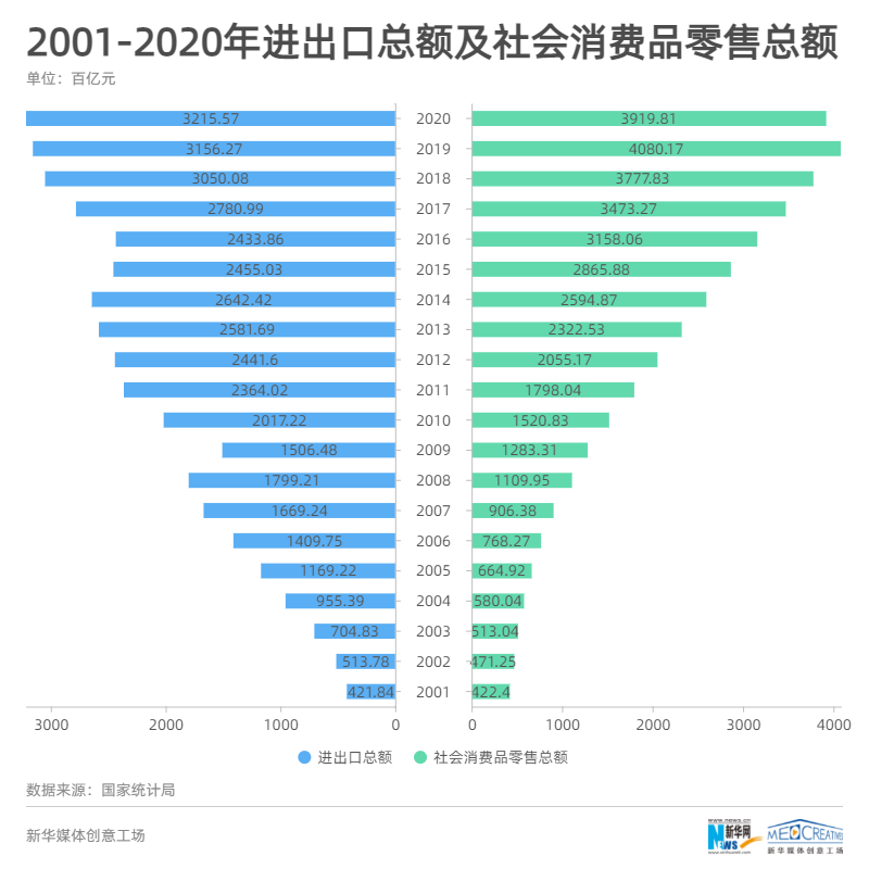 ??? 根據國家統計局公布數據顯示,2021年前三個月,我國社會消費品零售總額達到105221億元,同比增長33.9%,兩年平均增速為4.2%。二十年來,我國社會消費品零售總額由42240億元增長至391981億元。今年我國消費品市場將穩定擴大,預計社會消費品零售總額將以10%以上的速度加快增長。