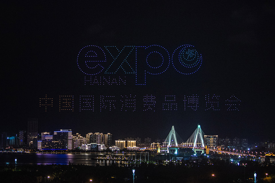 ??? 首屆中國國際消費品博覽會于5月7日至10日在位于??诘暮D蠂H會展中心舉辦。5月6日晚,??谑猩涎轃o人機表演秀,迎接首屆消博會的舉辦。新華社記者 蒲曉旭 攝