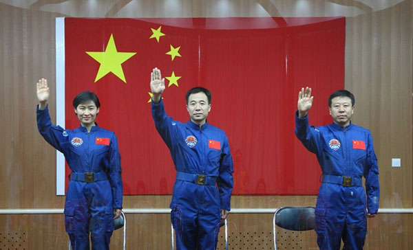 執行天宮一號與神舟九號載人交會對接任務航天員乘組與記者見面