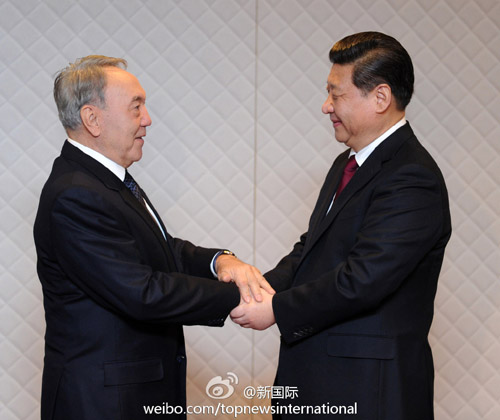 ????新華網北京3月24日電 據新華社“新國際”微博報道,去年金秋,習近平對哈薩克斯坦進行國事訪問。今年年初,中哈元首在索契冬奧會開幕式親切交談。23日,兩人在荷蘭再次會晤。習近平歡迎納扎爾巴耶夫總統5月訪華并出席上海亞信峰會。“作為候任主席國和首倡國,中哈更要共同努力,將峰會辦成團結友好、成果豐碩的盛會。”