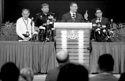 昨天,馬方發(fā)布會(huì)在吉隆坡舉行,代理交通部長(zhǎng)希沙姆丁(左三)在發(fā)布會(huì)上答記者問(wèn)。中新社發(fā)