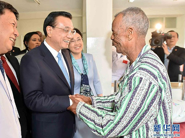 ??? 5月6日,中國國務(wù)院總理李克強(qiáng)與埃塞俄比亞總統(tǒng)穆拉圖一同來到亞的斯亞貝巴阿勒塔醫(yī)院,看望受益于中國免費(fèi)白內(nèi)障手術(shù)“光明行”活動的埃塞俄比亞患者。新華社記者李濤攝