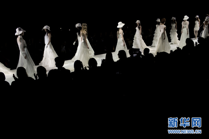 模特在T臺上展示西班牙女服裝設計師 Inmaculada Garcia的婚紗作品。Inmaculada Garcia同時也是來自巴塞羅那當地的一個婚紗品牌。