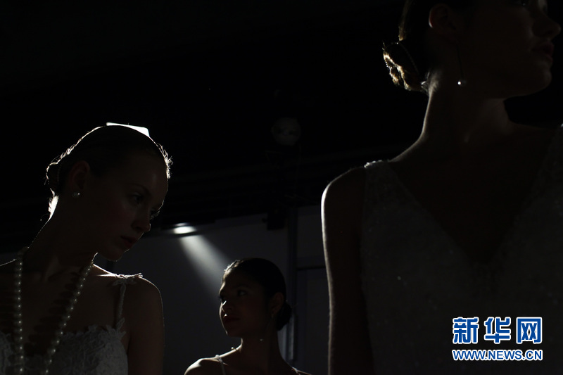 場外正在準(zhǔn)備登臺展示婚紗的模特。