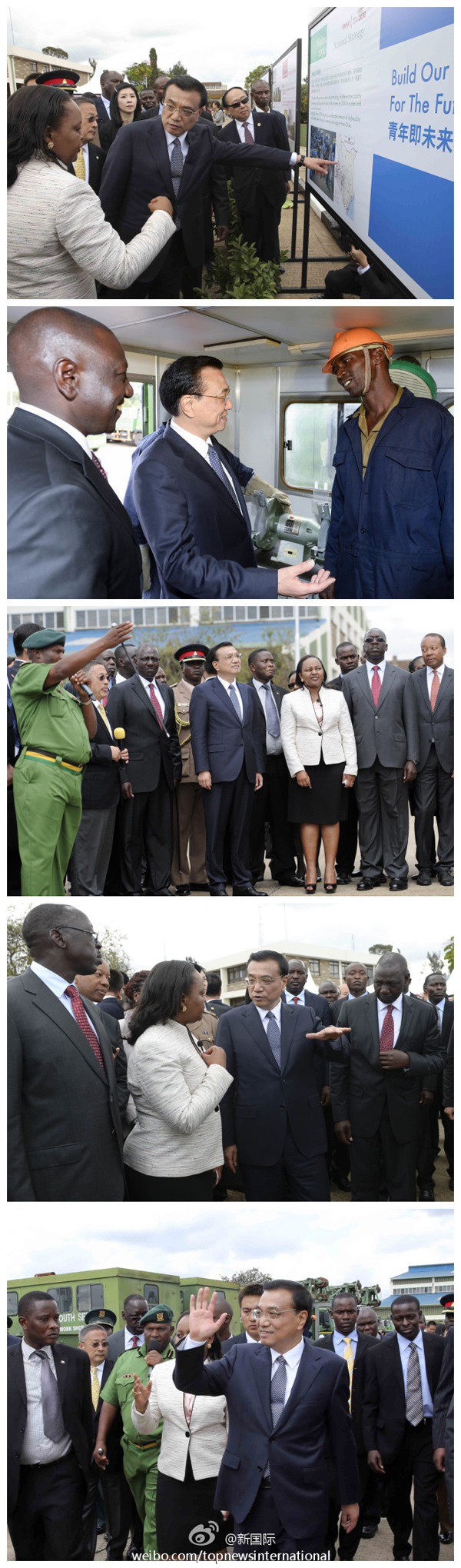 ????新華網(wǎng)北京5月11日電 據(jù)新華社“新國(guó)際”微博報(bào)道,李克強(qiáng)總理11日在肯副總統(tǒng)魯托陪同下到國(guó)家青年服務(wù)隊(duì)參觀。這里供學(xué)員實(shí)習(xí)的鉆井、起重、消防等裝備不少來自中國(guó)。李克強(qiáng)攀上一輛移動(dòng)維修車查看并詢問維護(hù)等服務(wù)情況。他說,要用好中國(guó)裝備和技術(shù)優(yōu)勢(shì),幫助非洲青年提升職業(yè)技能,促進(jìn)當(dāng)?shù)鼐蜆I(yè)。?
