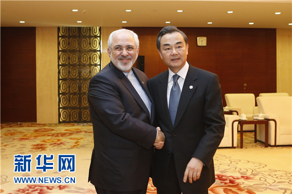 ????5月21日,中國外交部長王毅在上海會見陪同伊朗總統魯哈尼訪華的伊朗外長扎里夫。 新華社記者 張玉薇 攝