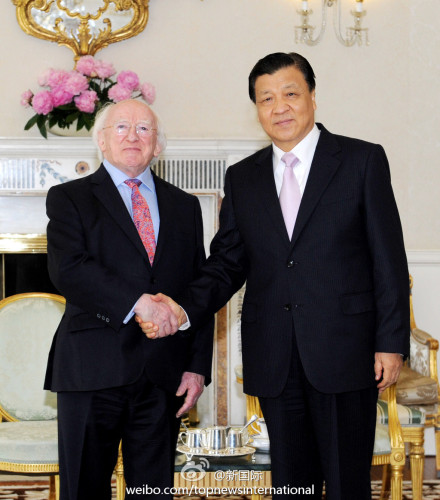 ??? 新華網(wǎng)北京6月18日電 據(jù)新華社“新國際”微博報(bào)道,中共中央政治局常委、中央書記處書記劉云山17日結(jié)束愛爾蘭之行。他在會(huì)見愛總統(tǒng)希金斯時(shí)說,中國與愛爾蘭雖相距遙遠(yuǎn),但在雙邊和國際事務(wù)中存在廣泛的共同利益,兩國關(guān)系成為不同幅員、制度、發(fā)展階段國家平等相待、友好合作的典范。