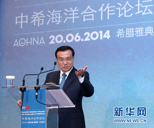 ??? 6月20日,國務院總理李克強在雅典與希臘總理薩馬拉斯共同出席中希海洋合作論壇并發表演講。新華社記者 龐興雷 攝