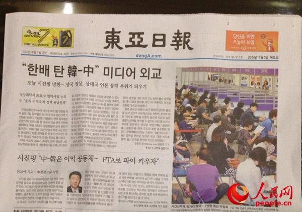 ??? 韓國《東亞日報(bào)》在頭版顯著位置刊發(fā)習(xí)近平主席署名文章《加快自貿(mào)區(qū)談判進(jìn)程 做大利益蛋糕》金慧廷 攝