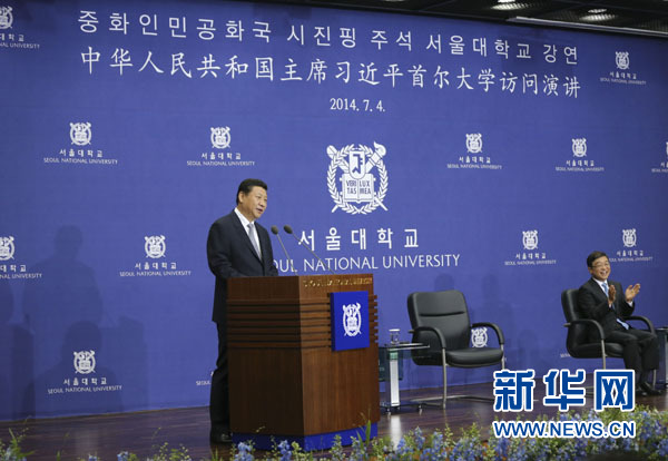 ????7月4日,國家主席習(xí)近平在韓國國立首爾大學(xué)發(fā)表題為《共創(chuàng)中韓合作未來 同襄亞洲振興繁榮》的重要演講。 新華社記者 蘭紅光 攝