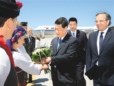 習(xí)近平抵達(dá)羅德島迪亞哥拉斯機(jī)場時,希臘總理薩馬拉斯專程從首都雅典前來,并率多名內(nèi)閣部長和羅德市市長到機(jī)場歡迎。習(xí)近平在舷梯旁同薩馬拉斯握手,互致問候。身著當(dāng)?shù)貍鹘y(tǒng)服裝的希臘青年向習(xí)近平獻(xiàn)花。希臘禮兵沿紅地毯兩側(cè)列隊,向習(xí)近平行注目禮。