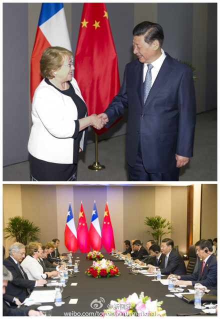 ??? 新華網(wǎng)北京7月17日電 據(jù)新華社“新國際”微博報道,習近平主席16日在會見智利總統(tǒng)巴切萊特時說,新形勢下,中智雙方要深挖雙邊貿(mào)易增長潛力,不斷加強重點領(lǐng)域投資合作,同時深化金融合作,形成以金融為引擎,貿(mào)易和投資兩個輪子一起轉(zhuǎn)的中智務實合作格局。(攝影:王曄、謝環(huán)馳)?