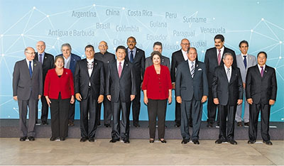 ? 當地時間7月17日下午,中國—拉美和加勒比國家領導人會晤在巴西利亞舉行。本次會晤由中方倡議,中國國家主席習近平、巴西總統羅塞夫、哥斯達黎加總統索利斯、古巴國務委員會主席兼部長會議主席勞爾·卡斯特羅、厄瓜多爾總統科雷亞、蘇里南總統鮑特塞、哥倫比亞總統桑托斯、智利總統巴切萊特、圭亞那總統拉莫塔爾、烏拉圭總統穆希卡、委內瑞拉總統馬杜羅、安提瓜和巴布達總理布朗等出席。