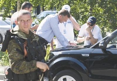 7月30日,烏克蘭頓涅茨克,歐安組織調查人員看地圖分析周圍安全形勢。由于烏內戰仍在繼續,調查人員已經連續4天未能進入MH17墜機現場。