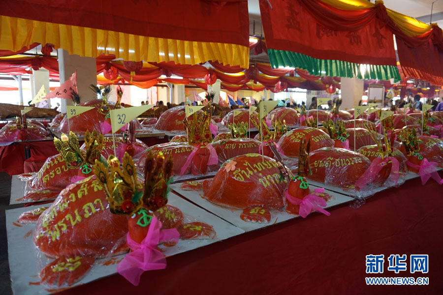 ????8月12日,泰國普吉府舉辦中國傳統的“中元普渡”活動,以普渡孤魂,表達仁愛和孝道思想。該活動在普吉已有150多年的歷史,每逢中國農歷7月,當地華人便會舉行祭祀儀式,用面粉和糖制成大小不一的紅色面團,裝飾成烏龜形狀,既表達了對于祖先的懷念,還傳遞了對于全家人健康長壽的祝福。圖為活動中用于祭祀的烏龜形狀糕點。新華網記者 楊云燕 攝