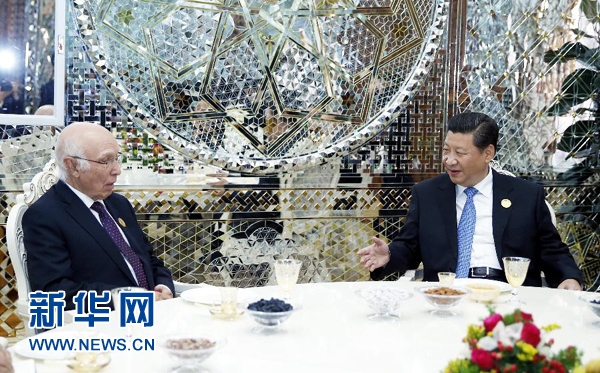 ????9月12日,國家主席習(xí)近平在杜尚別會(huì)見巴基斯坦總理國家安全和外事顧問阿齊茲。新華社記者鞠鵬攝
