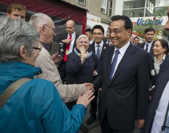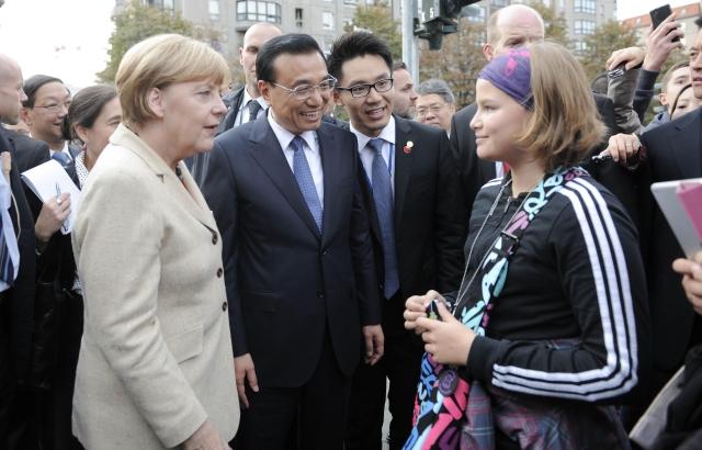 見到兩國總理到來,路邊不少民眾圍了上來,爭相與他們握手、合影。默克爾還把克強總理介紹給一位7、8歲的德國小女孩:“這是我的中國同事?!?/p>
