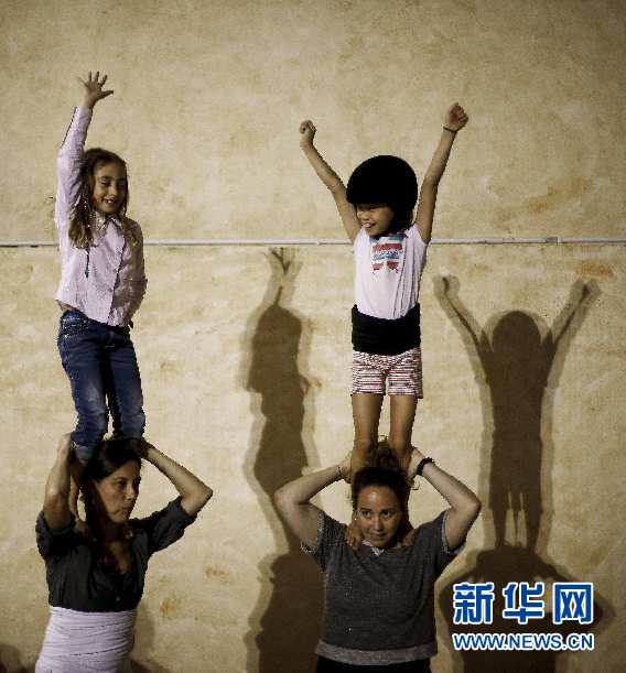 ????Jana(右上)踩在養(yǎng)母Thais(右下)肩上進行最基本的“疊人塔”訓練。新華社巴塞羅那分社攝影師Pau Barrena 攝