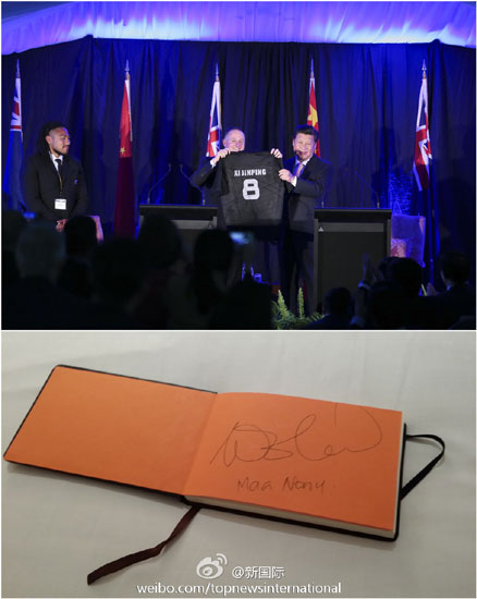 ??? 新華網(wǎng)北京11月20日電? 據(jù)新華社“新國際”微博報道,中新兩國領(lǐng)導(dǎo)人20日共見記者后,新西蘭英式橄欖球球星Ma'a Nonu贈送習(xí)主席一件球衣。習(xí)主席高興地說,歡迎你到中國交流、教學(xué)、比賽,推動英式橄欖球在中國的發(fā)展。Nonu興奮地說:“我現(xiàn)在就可以去!”