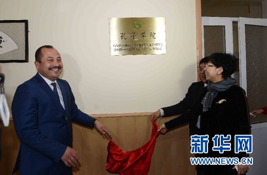 ????11月27日,烏茲別克斯坦撒馬爾罕國立外國語學院禮堂,撒馬爾罕國立外國語學院校長拉西莫夫(左)和中國駐烏茲別克斯坦大使館鄒艷輝參贊(右一)、上海外國語大學副校長周承一起為撒馬爾罕孔子學院揭牌。(新華網記者 沙達提 攝)
