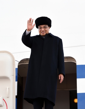 專機(jī)艙門打開(kāi),克強(qiáng)總理身著大衣,頭戴皮帽,一邊走下舷梯一邊向大家揮手致意。