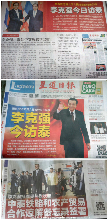 ??? 新華網(wǎng)北京12月20日電 據(jù)新華社“新國(guó)際”微博報(bào)道,泰國(guó)媒體紛紛在頭版頭條位置對(duì)李克強(qiáng)總理的泰國(guó)之行予以報(bào)道,社會(huì)各界高度關(guān)注。泰國(guó)《星暹日?qǐng)?bào)》在頭版刊登總理大幅照片,稱(chēng)總理此行將推動(dòng)和見(jiàn)證中泰兩國(guó)之間簽署多份友好合作協(xié)議,并回顧了2013年李克強(qiáng)總理訪泰時(shí)的情景。