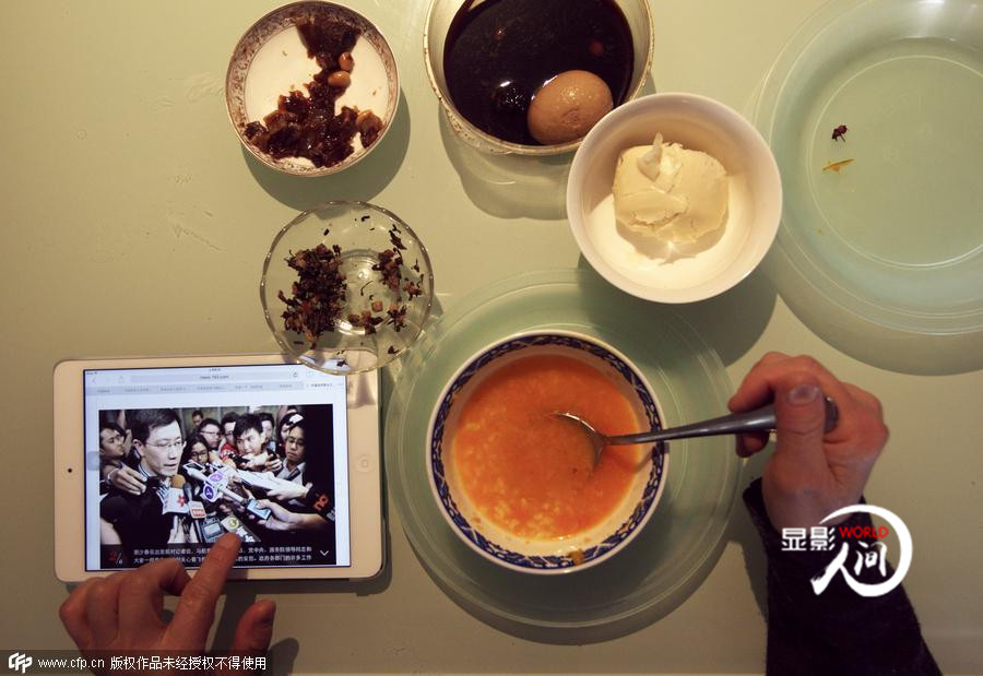 2014年3月11日,山東濟(jì)南,一名市民一邊吃著早餐,一邊翻閱IPAD,關(guān)注失聯(lián)航班MH370的最新動態(tài)。