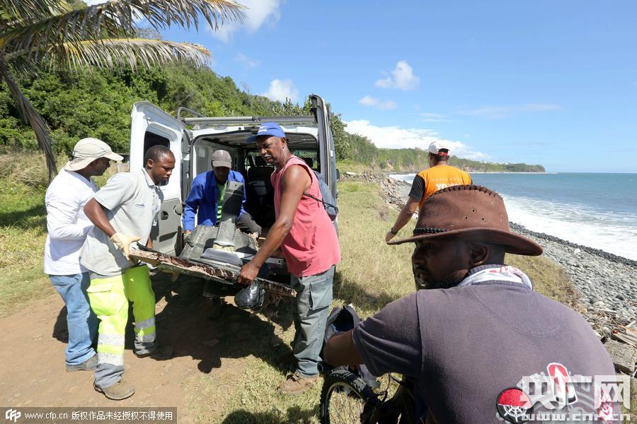 當(dāng)?shù)貢r(shí)間2015年8月11日,法屬留尼汪島,當(dāng)?shù)厮丫汝?duì)獲得的馬航MH370殘骸。