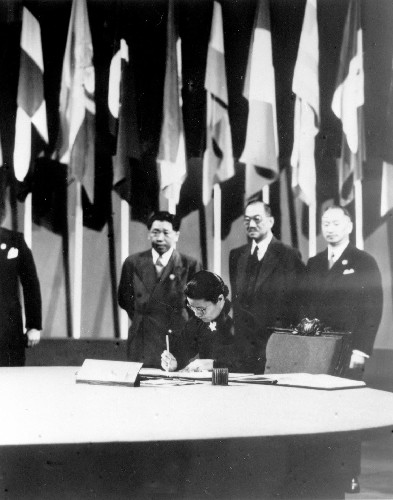 ??? 1945年10月24日,《聯(lián)合國(guó)憲章》經(jīng)安全理事會(huì)的5個(gè)常任理事國(guó)以及其他簽字國(guó)過(guò)半數(shù)批準(zhǔn),開(kāi)始正式生效。聯(lián)合國(guó)作為第二次世界大戰(zhàn)之后最大的國(guó)際性組織正式成立。此后,這一天被定為聯(lián)合國(guó)日。圖為中國(guó)代表團(tuán)成員吳貽芳(前)在憲章上簽字。 新華社發(fā)