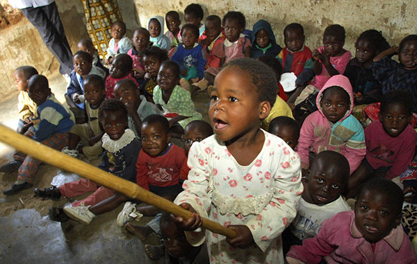 這是2001年8月13日,艾滋病患兒坐在馬拉維布蘭太爾市郊的一個孤兒看護中心里上課。(新華社發(fā))