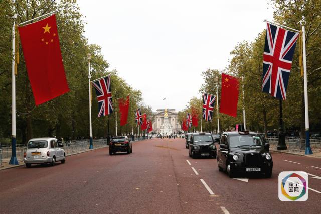 ????10月17日,在英國倫敦,中國國旗與英國國旗懸掛在白金漢宮前的林蔭路兩旁。