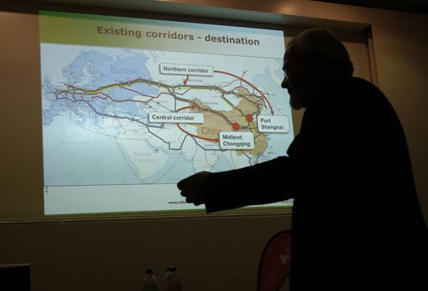 ↑投影顯示目前從中國聯通歐洲大陸的幾條鐵路線。