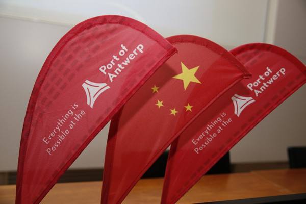 ↑會(huì)場的中國國旗與安特衛(wèi)普港標(biāo)識。