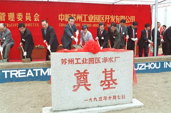 為了加快蘇州工業(yè)園區(qū)的建設(shè),中新兩國政府聯(lián)合協(xié)調(diào)理事會(huì)第二次會(huì)議1995年10月7日在江蘇蘇州舉行。新加坡副總理李顯龍、中國副總理李嵐清主持了這次會(huì)議。圖為1995年10月7日會(huì)議代表參加蘇州凈水廠的奠基儀式,左三為李嵐清,左四為李顯龍。
