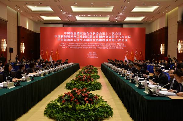 圖為10月27日拍攝的中新三個(gè)高層合作機(jī)制會(huì)議現(xiàn)場(chǎng)。2014年10月27日,中國新加坡雙邊合作聯(lián)委會(huì)第十一次會(huì)議、中國新加坡蘇州工業(yè)園區(qū)聯(lián)合協(xié)調(diào)理事會(huì)第十六次會(huì)議和中國新加坡天津生態(tài)城聯(lián)合協(xié)調(diào)理事會(huì)第七次會(huì)議在蘇州舉行。