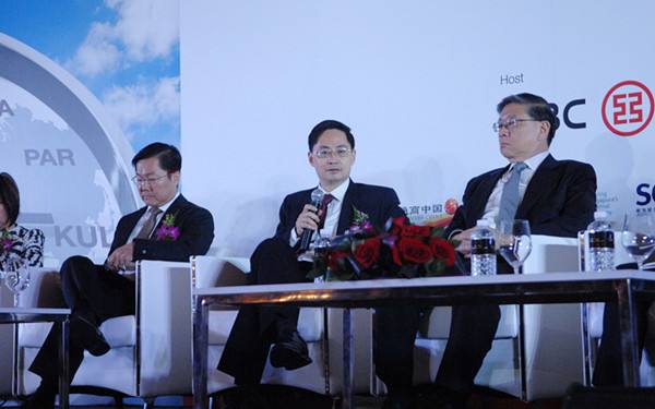 圖為2014年9月22日,中國人民銀行首席經(jīng)濟(jì)學(xué)家馬駿(中)在工行新加坡分行舉辦的人民幣國際化峰會(huì)上分享看法。當(dāng)日,中新兩國金融及其他企業(yè)界人士、政府官員等數(shù)百人參加了舉行的人民幣國際化峰會(huì),共同討論人民幣國際化的前景和路徑。