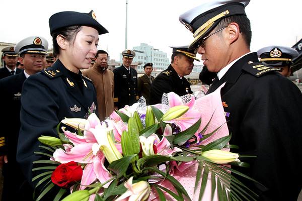 圖為中國海軍女兵向來訪的新加坡海軍軍官獻(xiàn)花。2010年3月8日,新加坡海軍登陸艦首訪上海。 當(dāng)日,新加坡海軍“堅(jiān)持”號(hào)登陸艦在艦長李順達(dá)海軍中校率領(lǐng)下駛抵上海,開始對(duì)上海進(jìn)行為期5天的友好訪問。這是“堅(jiān)持”號(hào)第一次訪問上海。