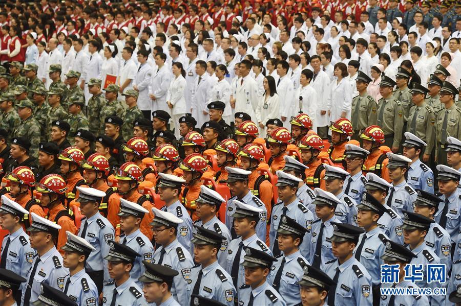 ??? 5月27日,駐杭部隊官兵、武警官兵、公安干警、志愿者、醫護人員、賓館保障人員及各界代表參加誓師大會。 當日,“決戰100天全力保峰會”迎接G20誓師大會在浙江杭州舉行。 新華社記者黃宗治攝
